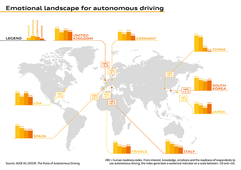 「ヒューマンレディネスインデックス(HRI)」は、社会人口統計学的に見た自動運転に対する考え方の洞察を提供します。その結果、回答者が若く、教育と収入のレベルが高いほど、自動運転に対する態度が前向きであることが判明しました。調査した国の間でも、違いが明確になっています。中国人(HRI +5.1)は自動運転を積極的に受け入れる傾向にあり、韓国人(HRI +1.2)もテクノロジーに対する肯定的な見方で平均を上回っています。ヨーロッパでは、スペイン人とイタリア人(共にHRI +0.7)がこの指標で高い数値を示しています。ドイツ人とフランス人(共にHRI -0.7)は消極的な傾向で、アメリカ人、日本人、イギリス人(すべてHRI -0.9)も同様です。HRIは、自動運転車を利用するための知識、関心、感情、準備といった項目を組み合わせて、「-10」〜「+10」の数値指標を生成します。
