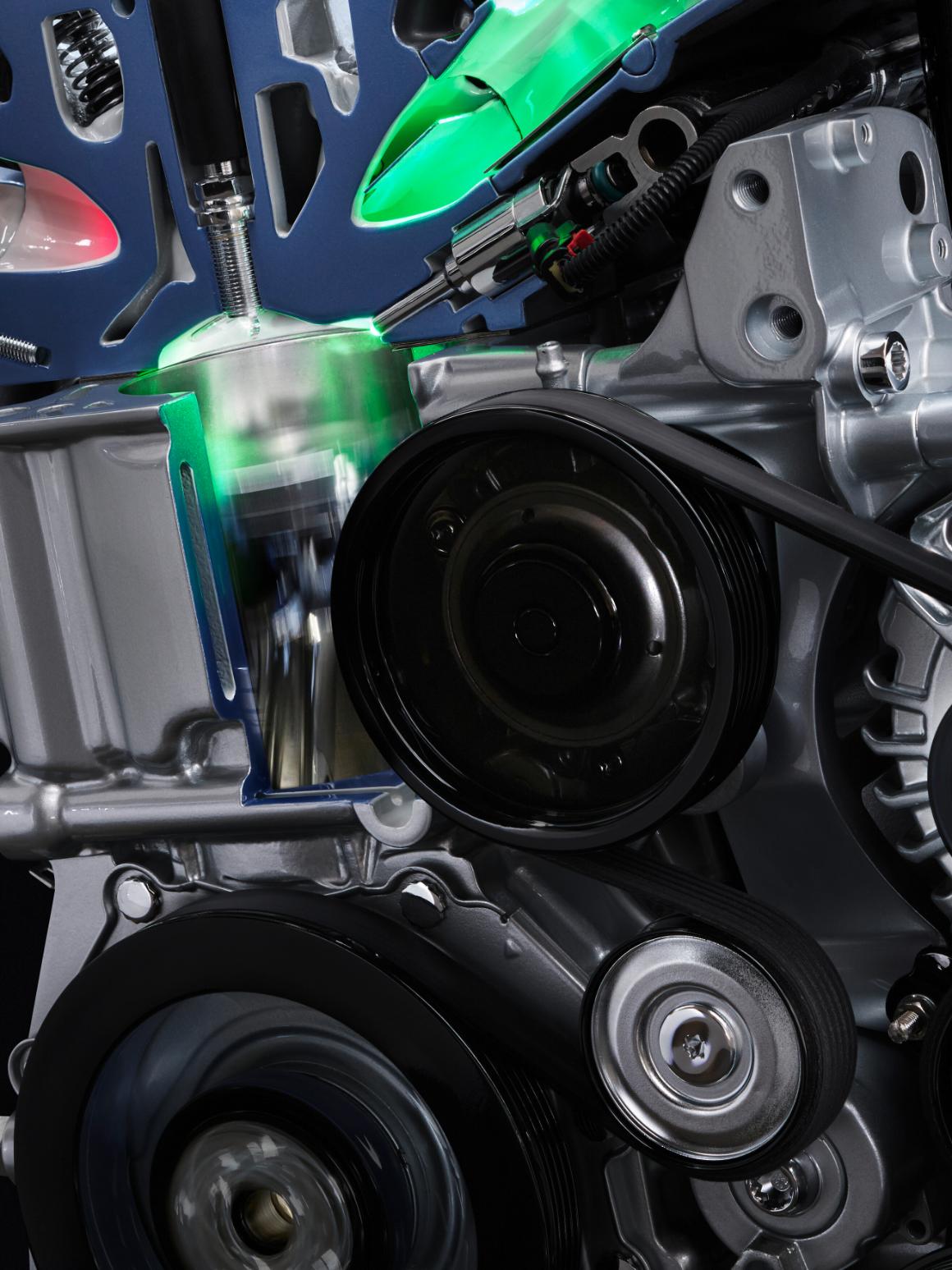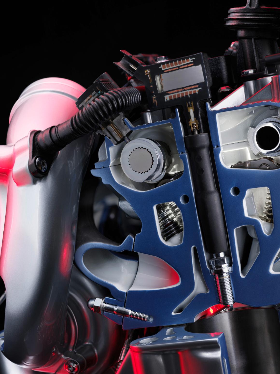 広範な対策により、内部摩擦、摩耗、燃料消費を低減し、パワーの最適化を実現しています。これには、プラズマコーティングされたシリンダーライナーや、冷却を改善する、アルミニウム製ピストンの底部に設けられた特殊なオイルチャネルなどが含まれます。