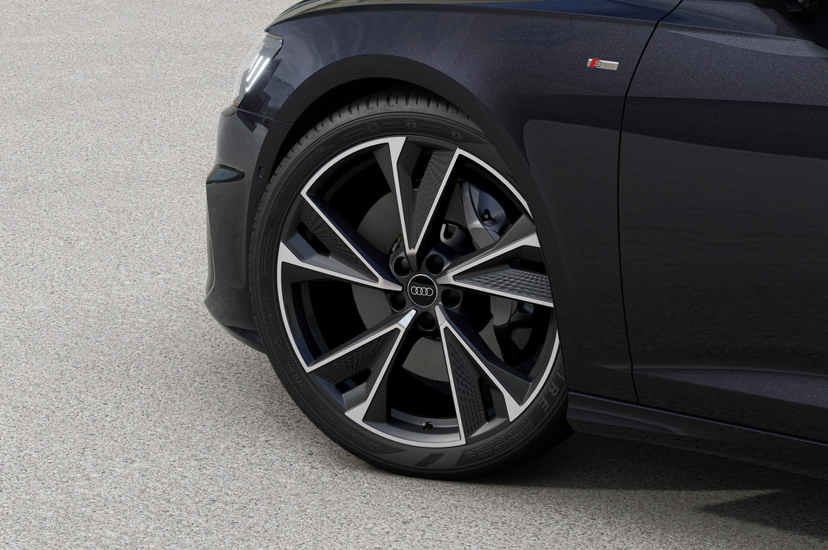 エクステリアには、特別装備のセブリングブラック クリスタルエフェクトのボディカラーを採用し、深みのあるブラックがエレガントかつダイナミックな存在感を演出します。アルミホイールはアンスラサイトブラックポリッシュ仕上げの5Vスポークストラクチャーデザイン(8.5J×21)を装着し、255/35 R21タイヤとの組み合わせによってスポーティな印象を与えます。ダークヘッドライトハウジングとの組み合わせにより、力強く引き締まった外観を作りだしています。また、流麗なルーフラインにはRSルーフスポイラーを装備し、ブラックAudi rings & ブラックスタイリングパッケージを採用することによって、アウディのスポーティなDNAを表現しています。さらにAudi rings、シングルフレームグリル、ウィンドウモールディング、ルーフレールをブラックで統一することで、Audi A6 Avantの優雅なプロポーションに、ブラックを基調としたスポーティな力強さを融合させ、インテリジェントでパワフルなエクステリアに仕上がっています。